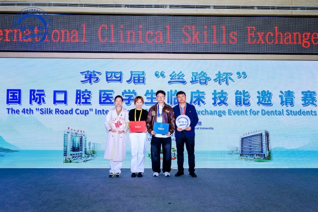 本届“丝路杯”赛事汇聚了中国、日本、西班牙、奥地利等4国37所知名口腔医学院校的150余名师生同台竞技。比赛采用“人机结合”的评分模式,全面考察学生的临床实践能力与创新素养。本科组重点考核基础技能操作,研究生组则更加侧重综合思辨与创新应用能力。比赛中,陈景昊同学在全瓷冠牙体预备、口内切开缝合等项目中操作规范、精准到位;刘梦竹同学在显微根管治疗、临床思辨等环节中沉着应对,展现出全面的专业素养,赢得了评委的一致好评。
