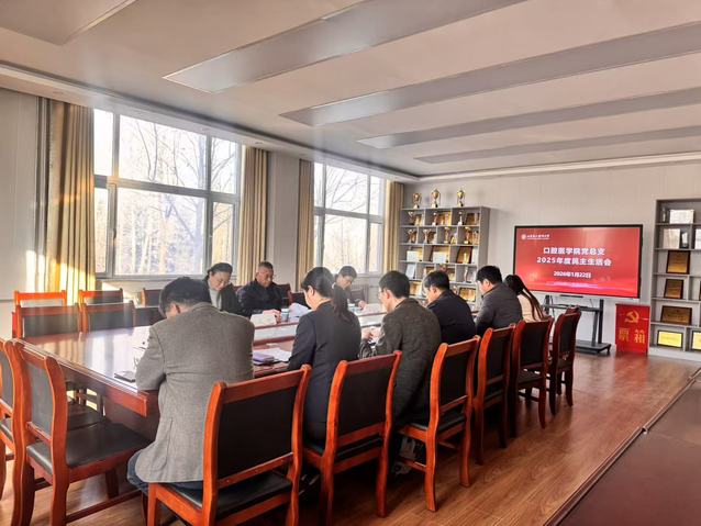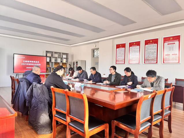 2026年1月22日,口腔医学院党总支在学院会议室召开2025年度民主生活会。学校督导组组长、校党委委员、副校长田玉胜,督导组成员卢官庐、孔宇到会监督指导。学院党总支书记邱玉刚主持会议,总支班子全体成员参会。